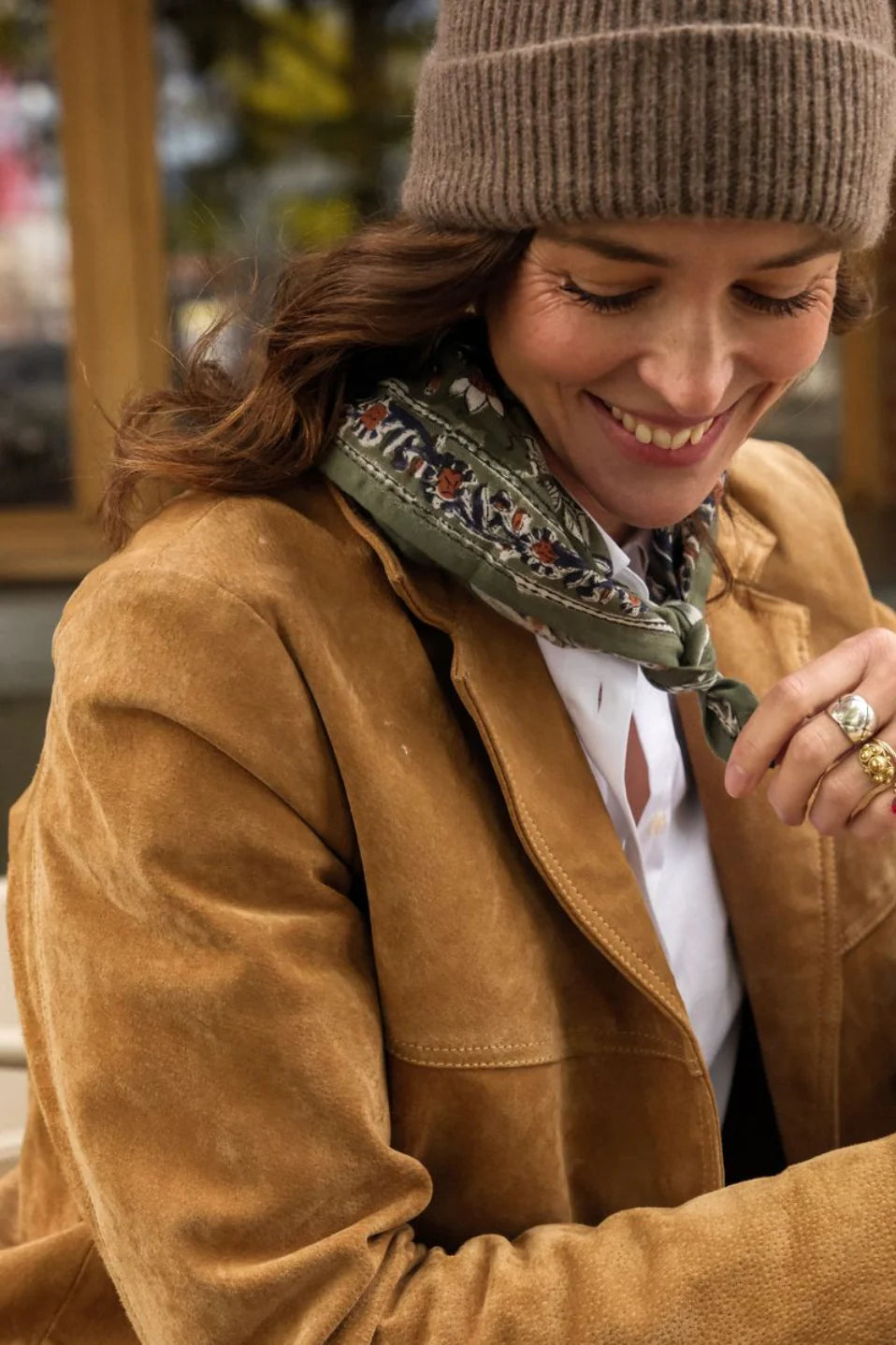 En raison du procédé de teinture naturelle utilisé, les foulards peuvent déteindre par frottements sur d'autres matières. Nous vous recommandons donc de les laver à 30°C programme délicat seuls ou avec des coloris similaires avant de les porter pour la première fois.